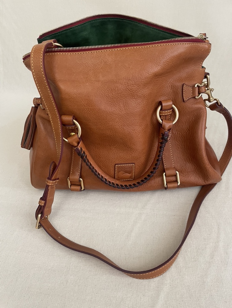 Dooney & Bourke handbag is made with soft brown leather and has top handles and a shoulder strap; 4 inner pockets and zip closure.