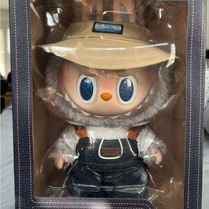 Authentic Labubu Doll and a Mini! "Fall in Wild" themed Labubu from "The Monsters" series depicts Labubu in an outdoorsy style, complete with a tan bucket hat, white t-shirt, and denim overalls, holding a soft daisy flower.