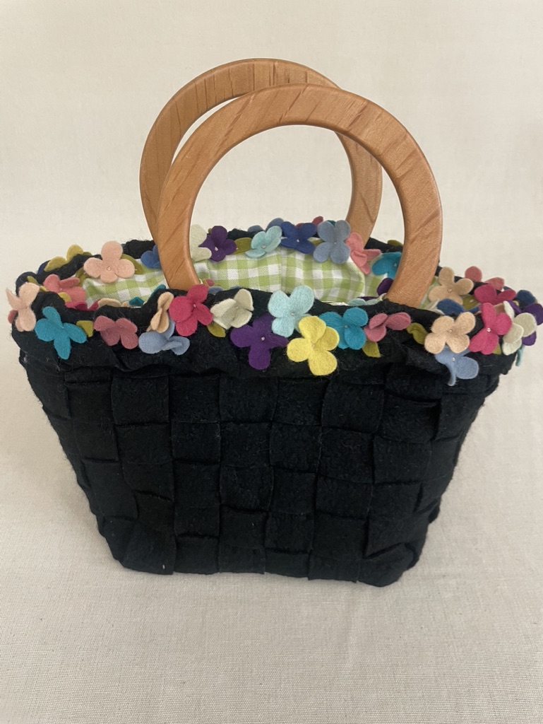 Black and floral fleece handbag with wooden handles and a cheerful green and white plaid lining.