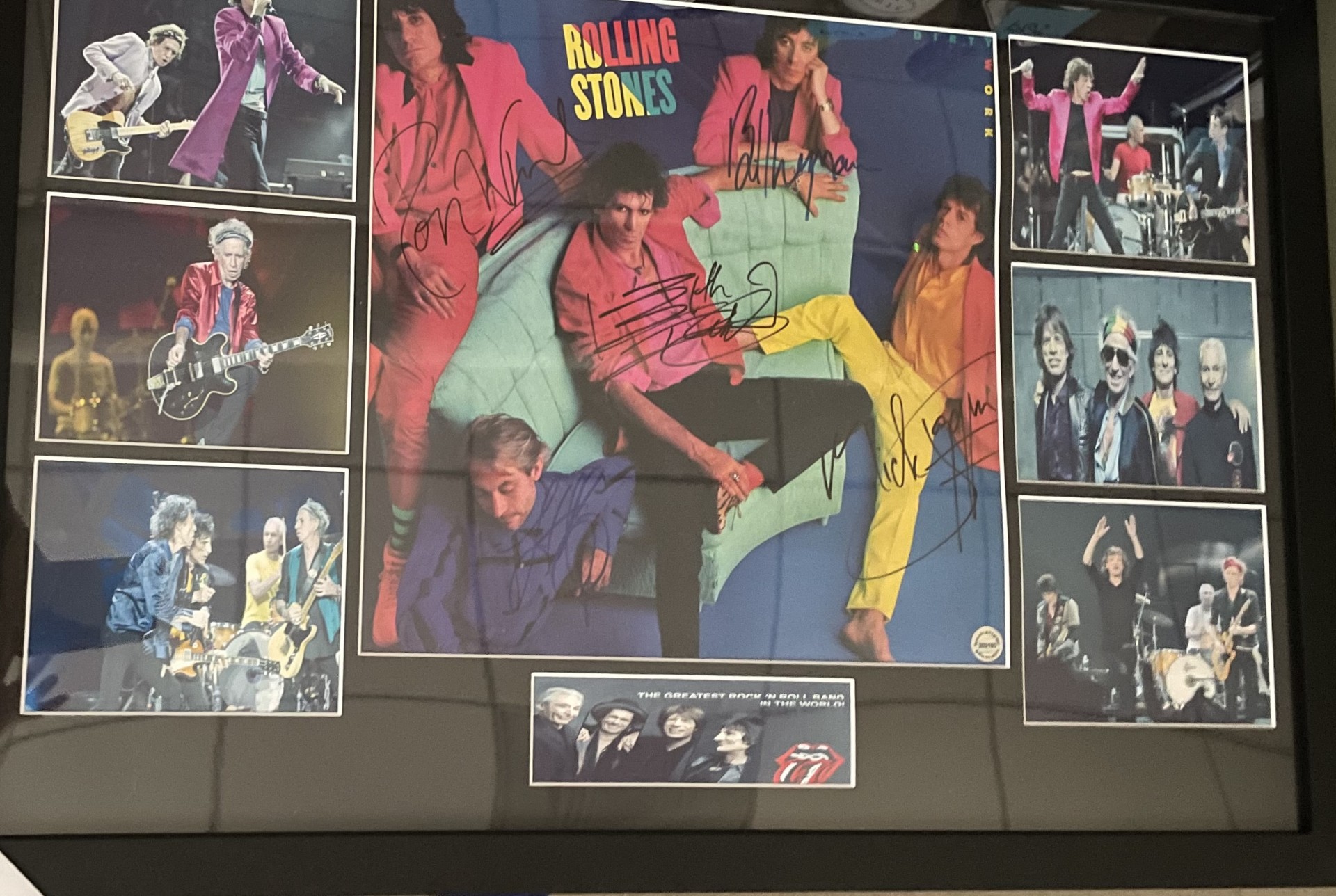 Own a piece of music history! This official Rolling Stones 1986 Dirty Work Album is autographed by all 5 members of the legendary Rolling Stones; Keith Richards, Bill Wyman, Ron Wood, Charlie Watts, and of course Mick Jagger. The album's cover photo was taken by Annie Leibovitz. Framed with additional photos of the band members performing at one of their iconic concerts. Incudes a forensic autograph Letter of Authenticity.