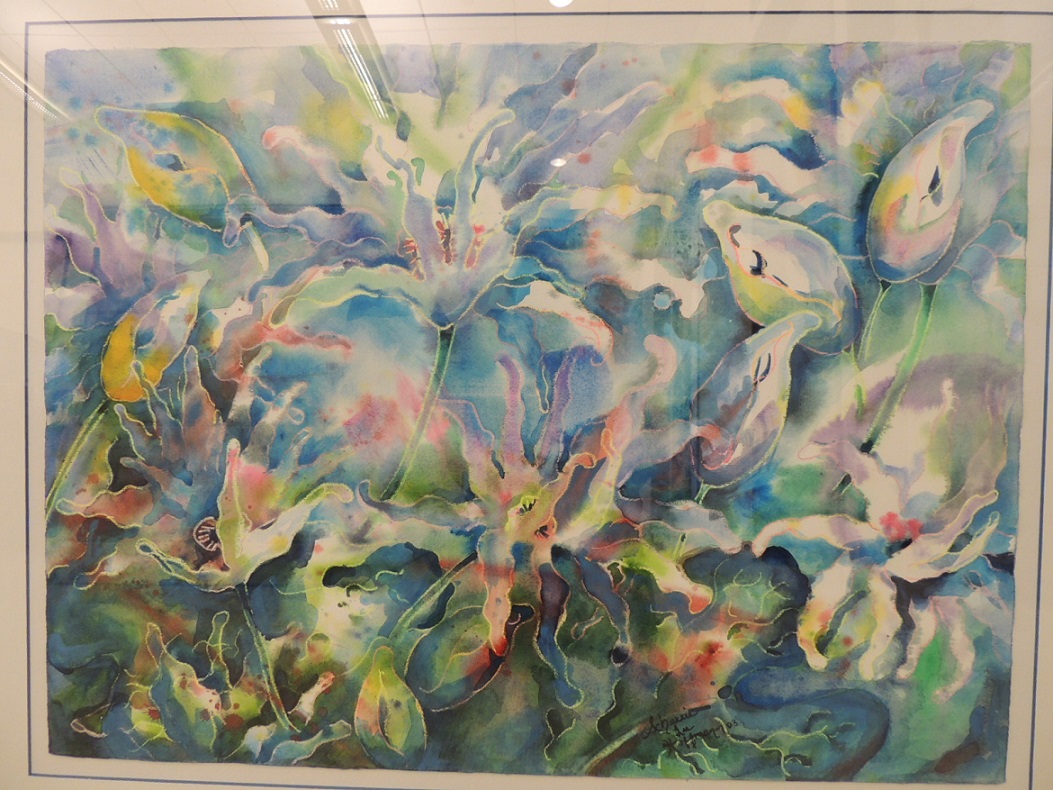 "Mystic Pond" 22"x30" framed watercolor painting representing mystic flowers in a pond.